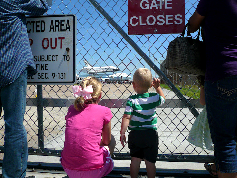 we LOVED it!! we even ran into an old friend of momma's from nasa and went to eat lunch with his family, then we came back to ellington later and made the trek to see the shuttle and airplane a little closer. and believe it or not, we ran into another friend of momma's there too! she and her kids walked around with us and helped us out a lot. luke even made friends with the cute girl pretty quickly...
